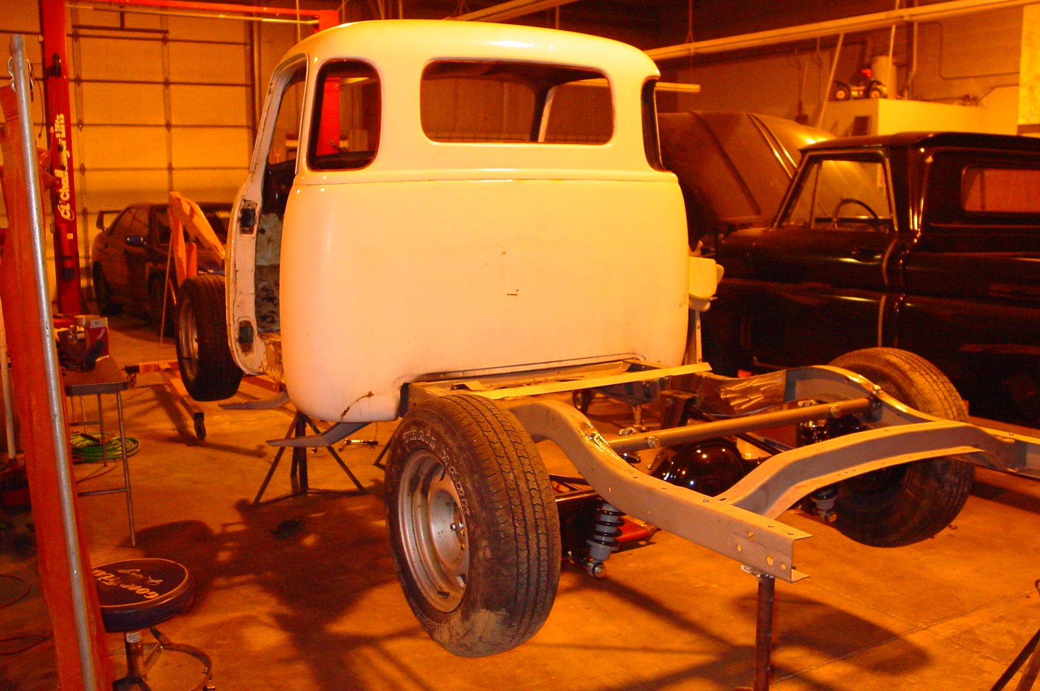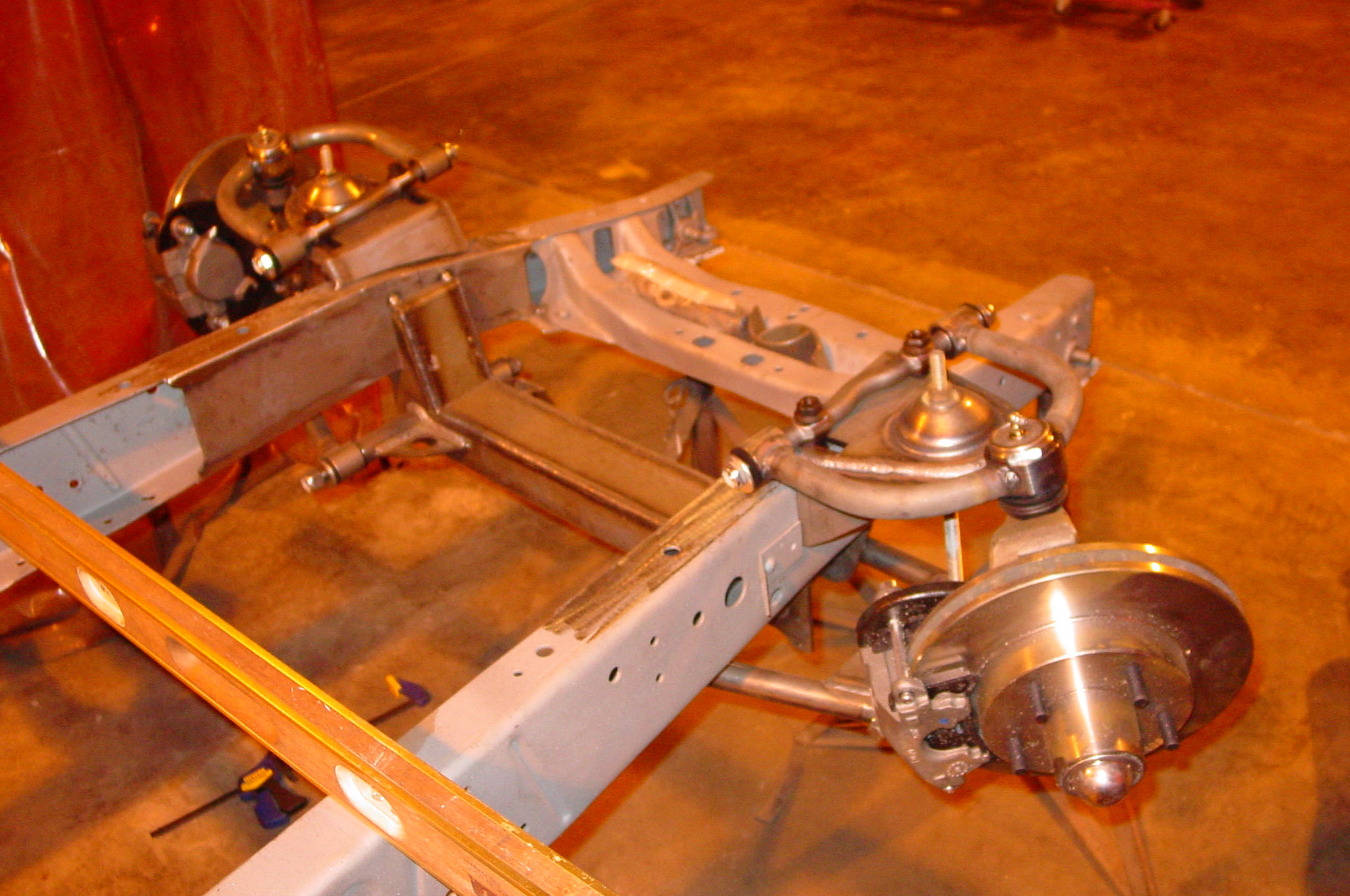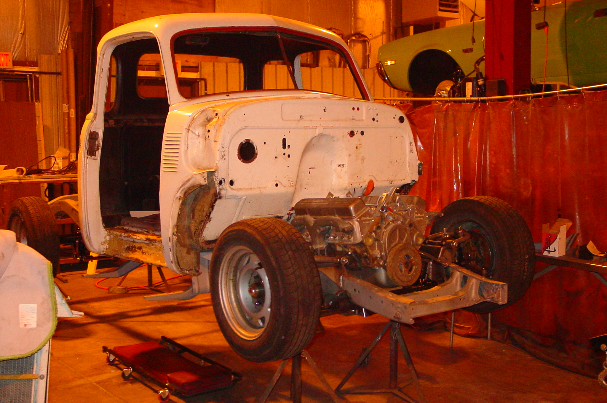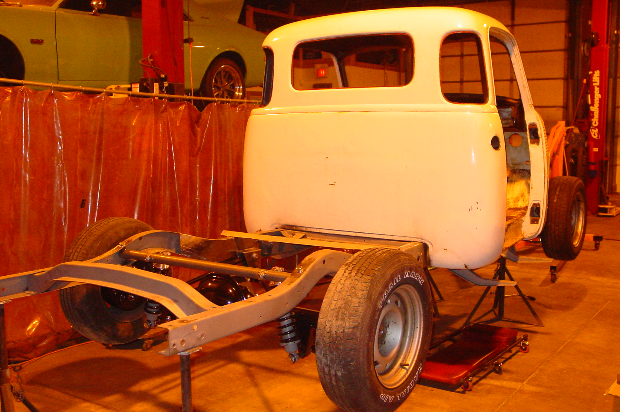 Converting a 49 Chevy pick-up to independent front suspension with disc brakes, from the stock straight front axle and drum brakes. Adding a four link rear suspension with coilovers and a new Ford 9" in the rear. Boxing the frame in the critical structural areas. We also repaired some rusted holes in the frame. A slight chop to the top may be on the agenda next. The top has now been chopped 2 inches. This gives the truck a good look without being two extreme.