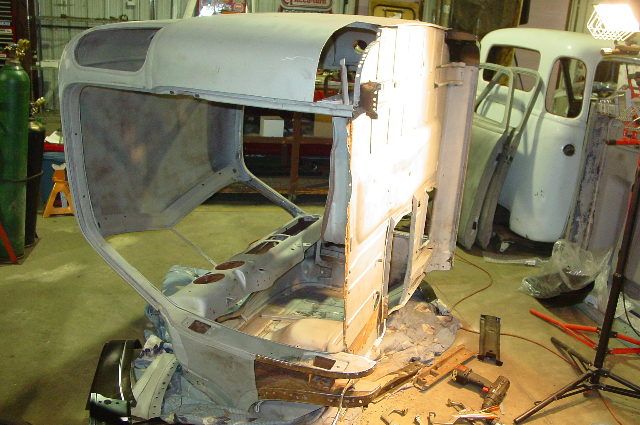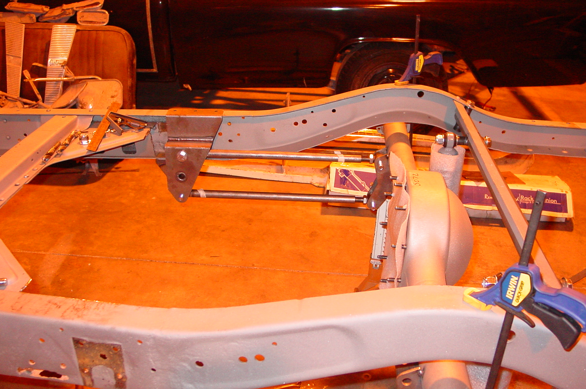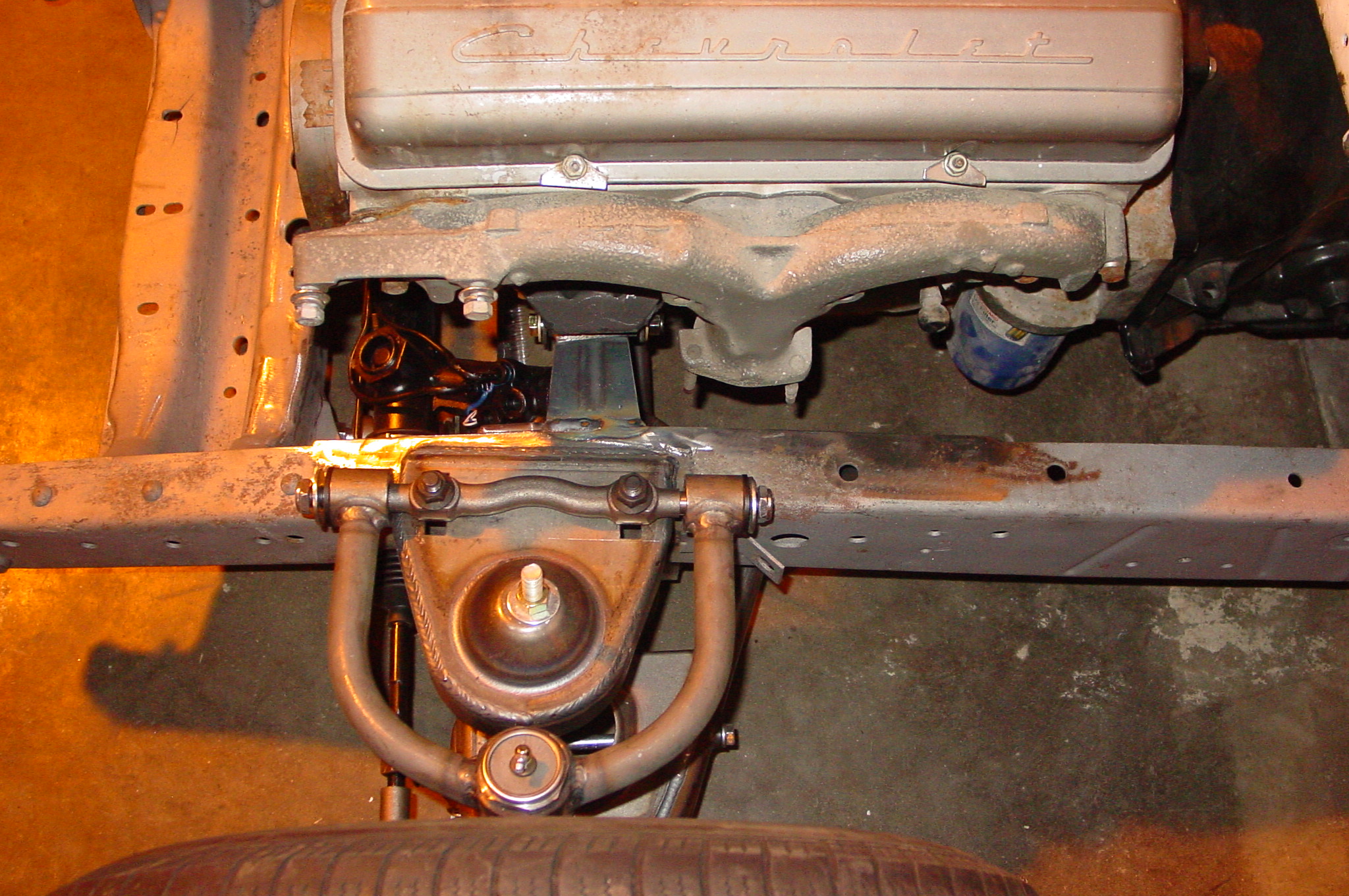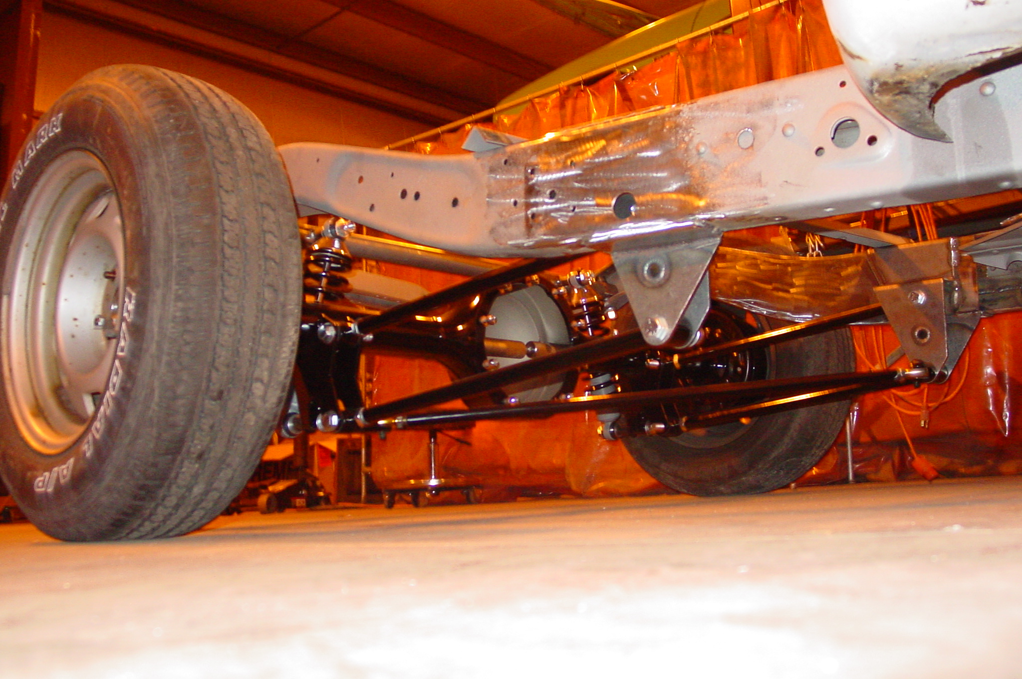 Converting a 49 Chevy pick-up to independent front suspension with disc brakes, from the stock straight front axle and drum brakes. Adding a four link rear suspension with coilovers and a new Ford 9" in the rear. Boxing the frame in the critical structural areas. We also repaired some rusted holes in the frame. A slight chop to the top may be on the agenda next. The top has now been chopped 2 inches. This gives the truck a good look without being two extreme.