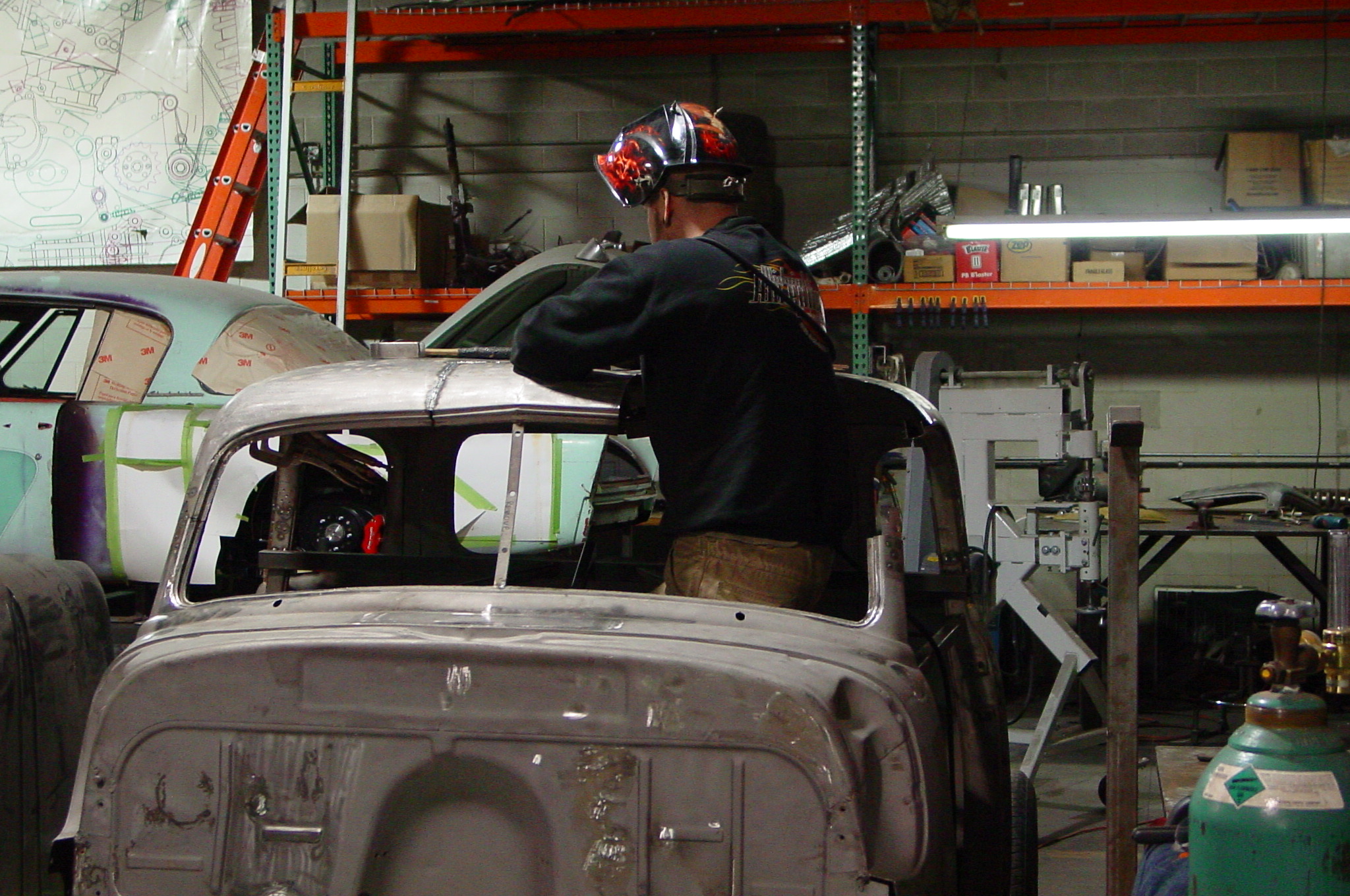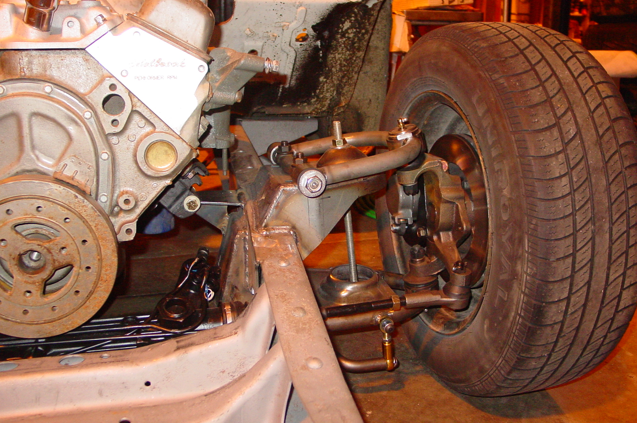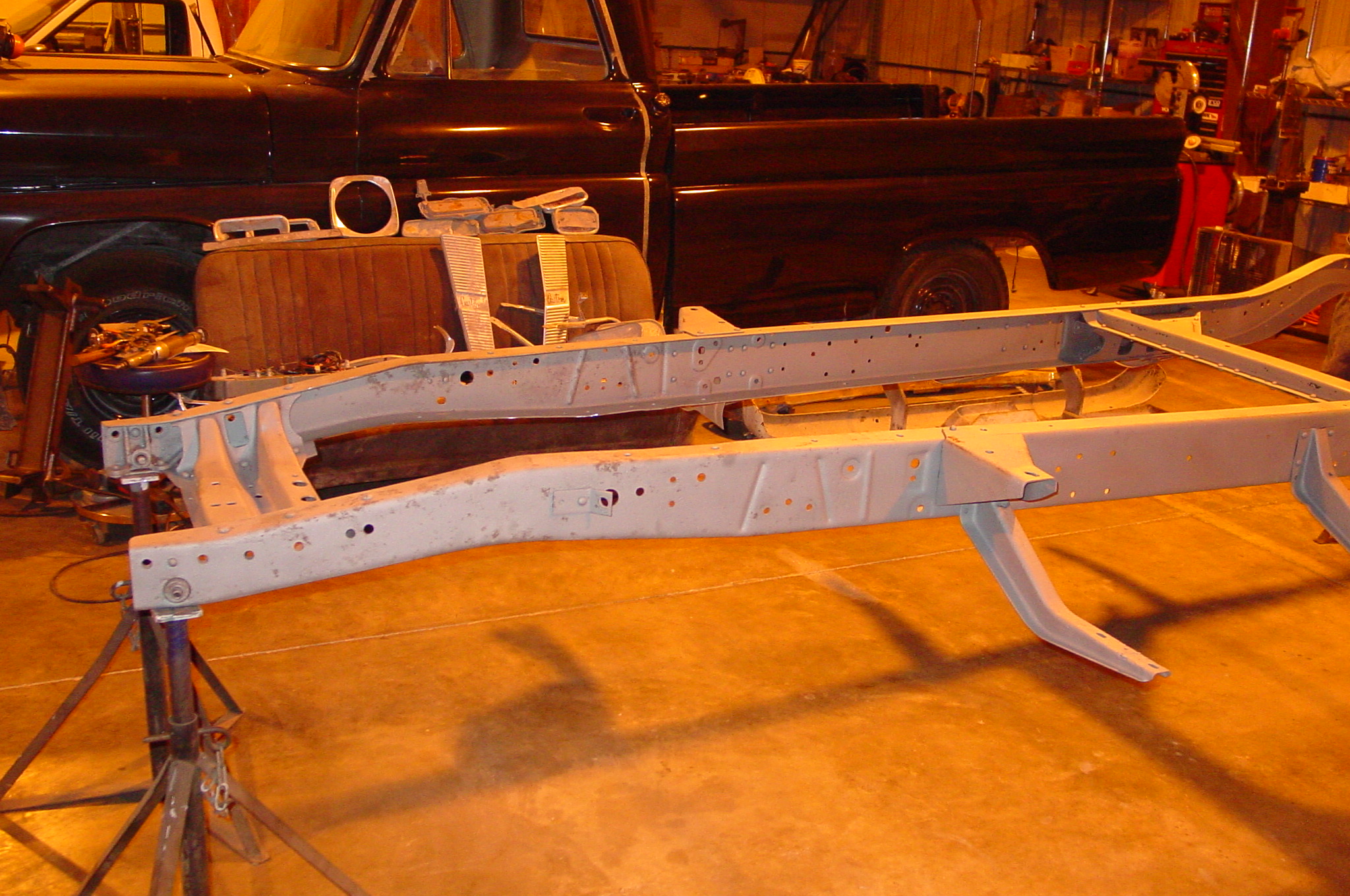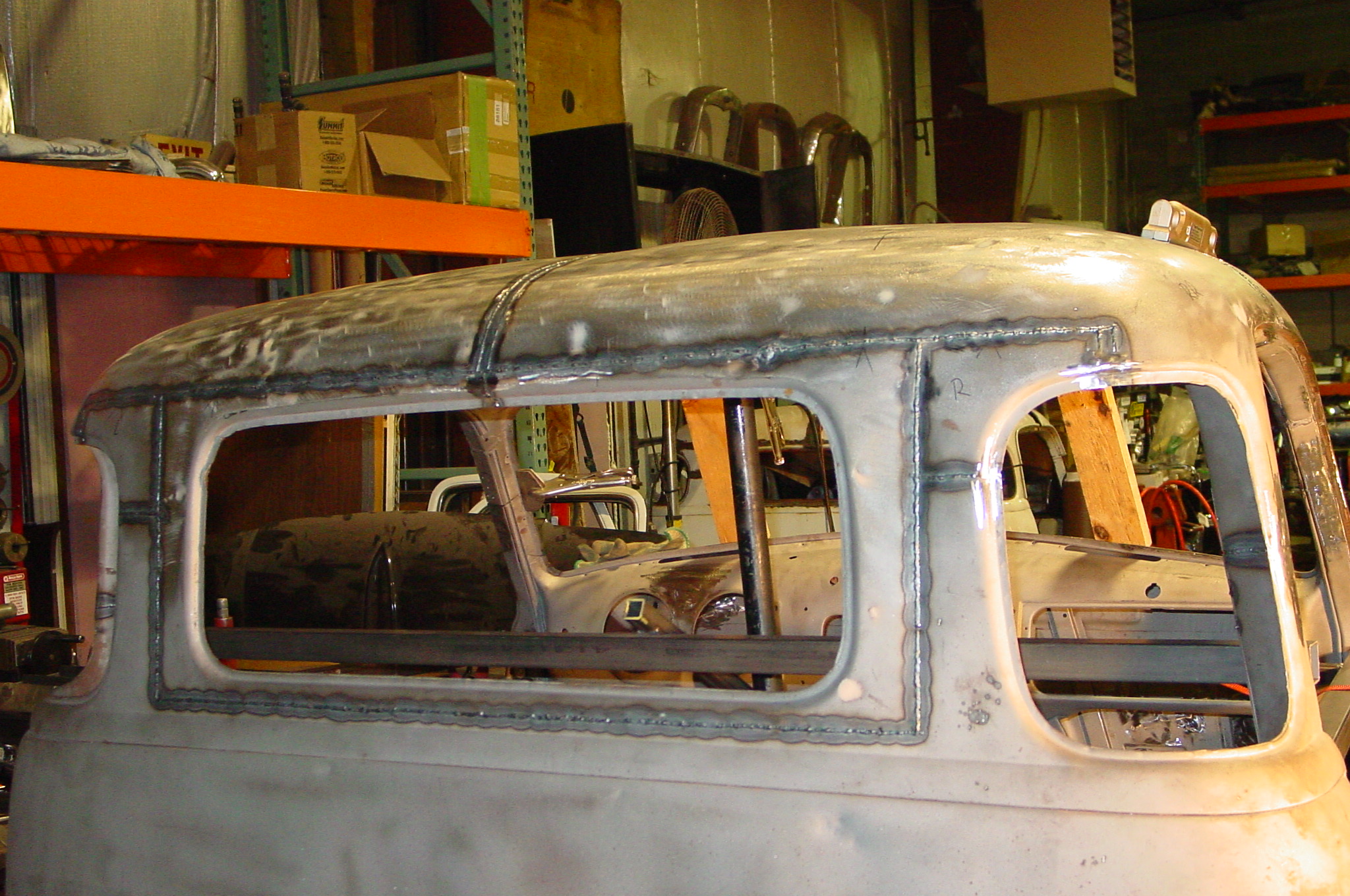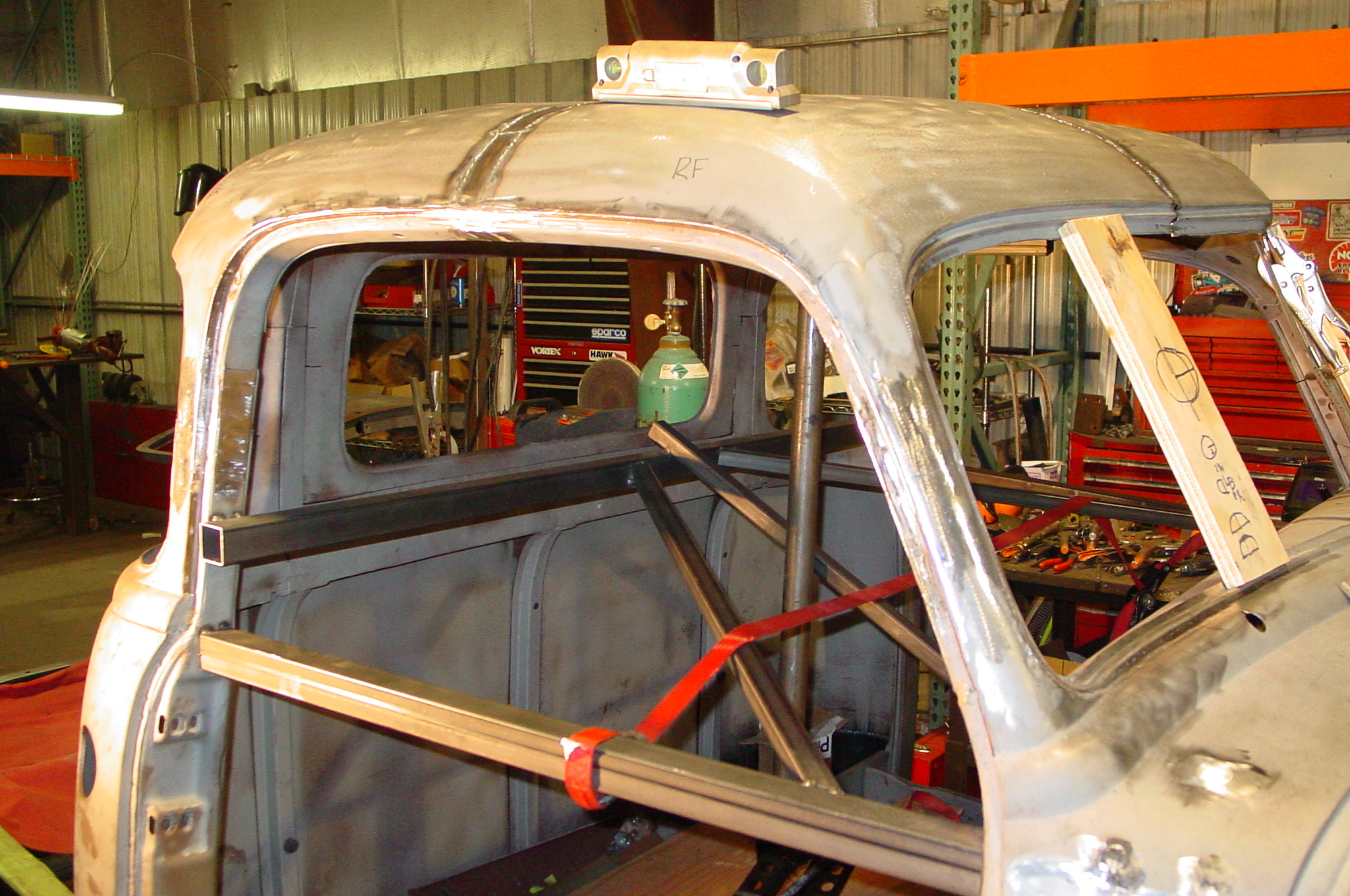 Converting a 49 Chevy pick-up to independent front suspension with disc brakes, from the stock straight front axle and drum brakes. Adding a four link rear suspension with coilovers and a new Ford 9" in the rear. Boxing the frame in the critical structural areas. We also repaired some rusted holes in the frame. A slight chop to the top may be on the agenda next. The top has now been chopped 2 inches. This gives the truck a good look without being two extreme.