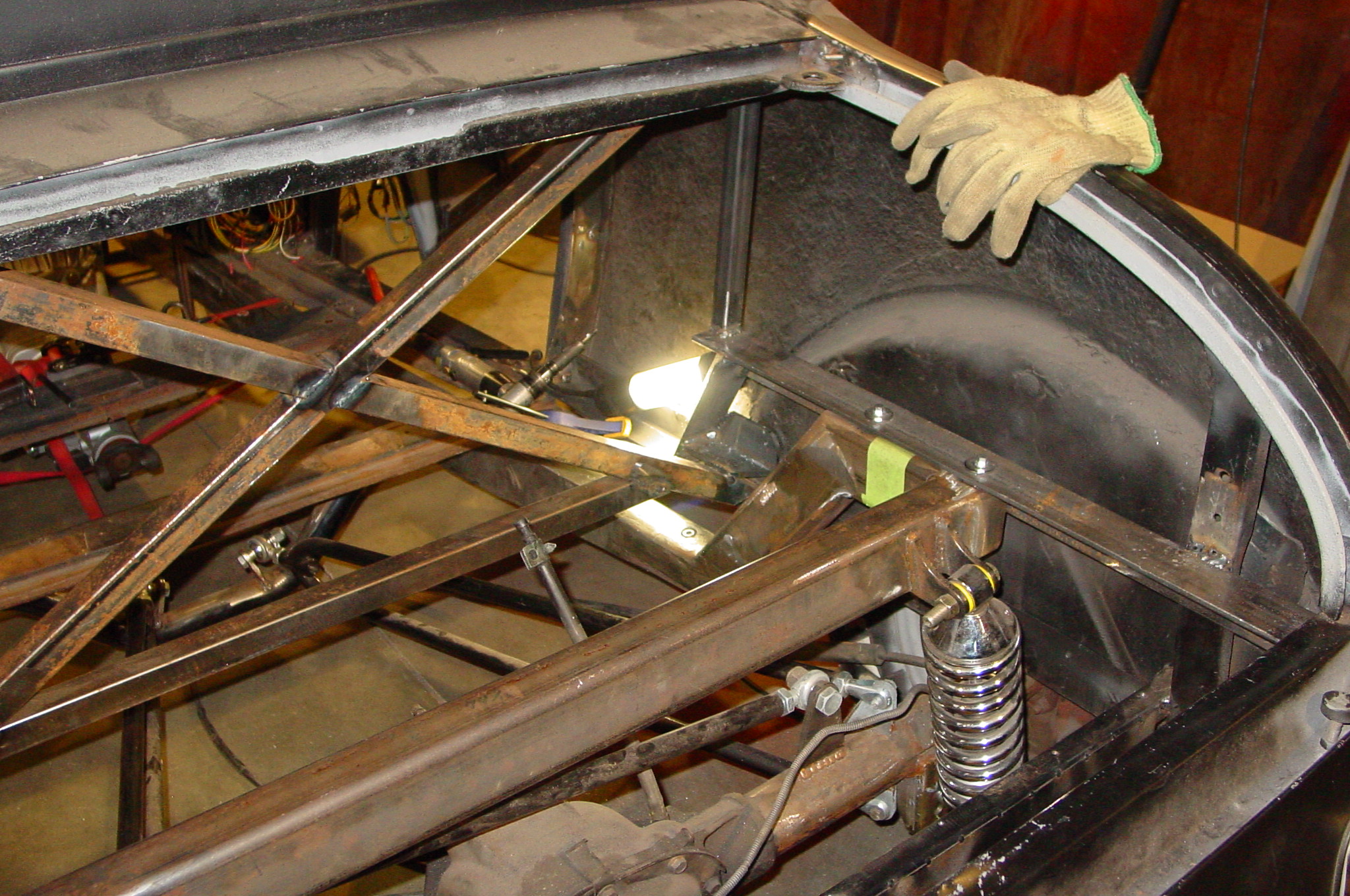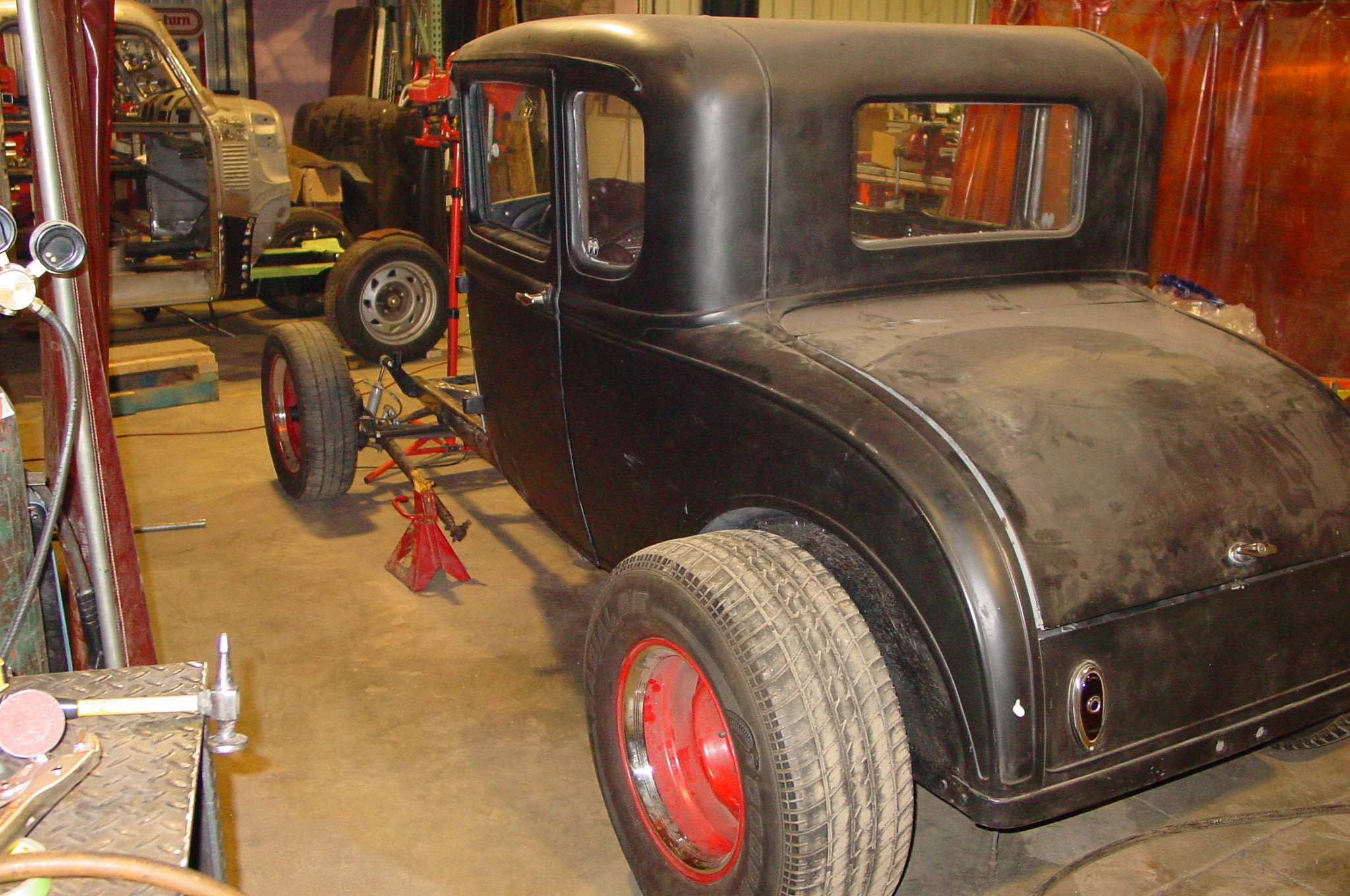 This car was at another shop supposedly being built !! We found several things with the chassis that were wrong and not complete. After the repairs were completed we were able to focus on completing the build for Matt. We have the motor mounted in and the transmission corssmember in place. The rear suspension in now in place with the front soon to follow. We have the interior tined in up to where the top will be chopped. The fuel cell is in place along with the battery mount. The trunk is now tined. The plan is to chop the top 3".... The brake lines are taking shape and an aluminum radiator in on the way.  Stay tuned..
