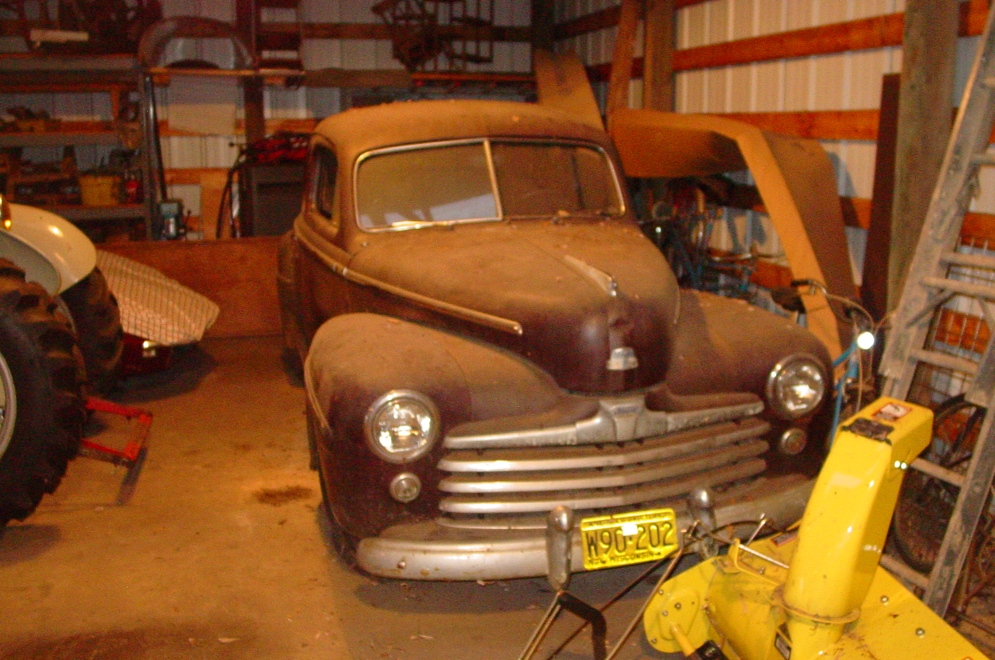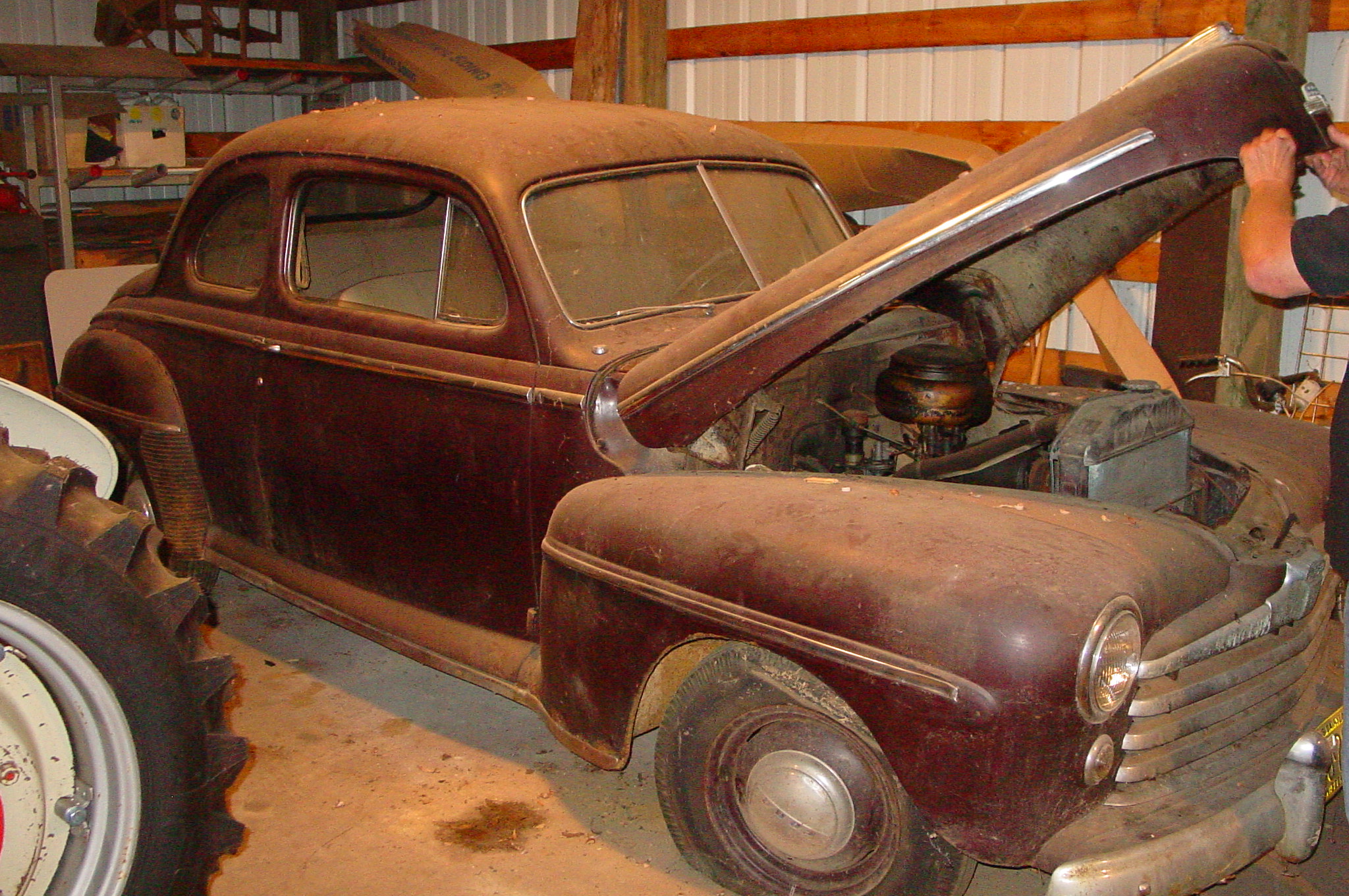 SOLD    1948 Ford Coupe. This car has been in storage since 1969. At that time it was driven in and the engine had oil put into the cylinders. All of the trim is there and in very good shape. The interior in complete and in fair shape. There is also a Ford visor that is in the back seat. The body is in excellent shape for the age, with a few rust spots.